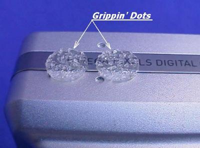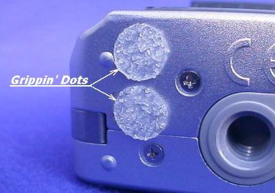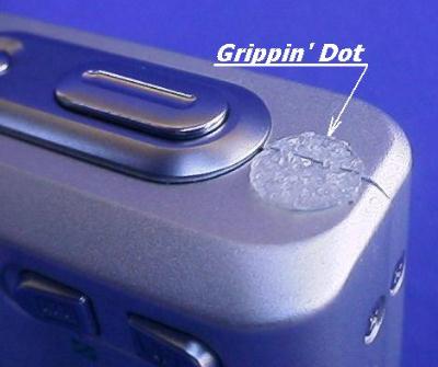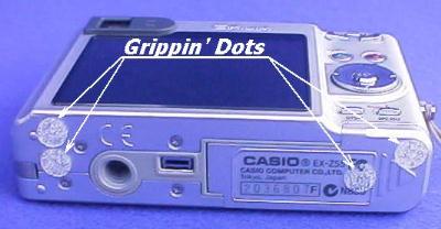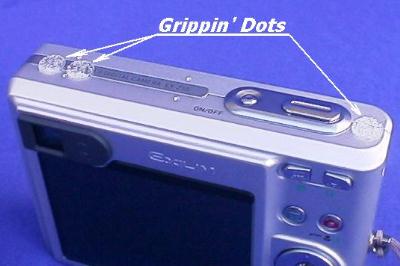 These tiny self-sticking "dots" provide traction points where you need them on your digital camera or many other handheld devices. Grippin' Dots are little, but they make a BIG difference in how your camera feels in your hands. They're simple to apply ... peel off the paper backing ... press them on, and you're done. They won't damage the surface of your camera, and they stay put until you remove them. One packet contains enough Grippin' Dots to apply to several digital cameras or your cell phone, PDA, etc.